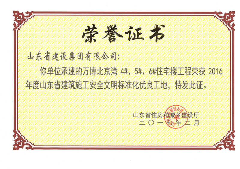 萬博·北京灣4#5#6#住宅樓工程榮獲2016年度省建筑施工安全文明標準化優良工地