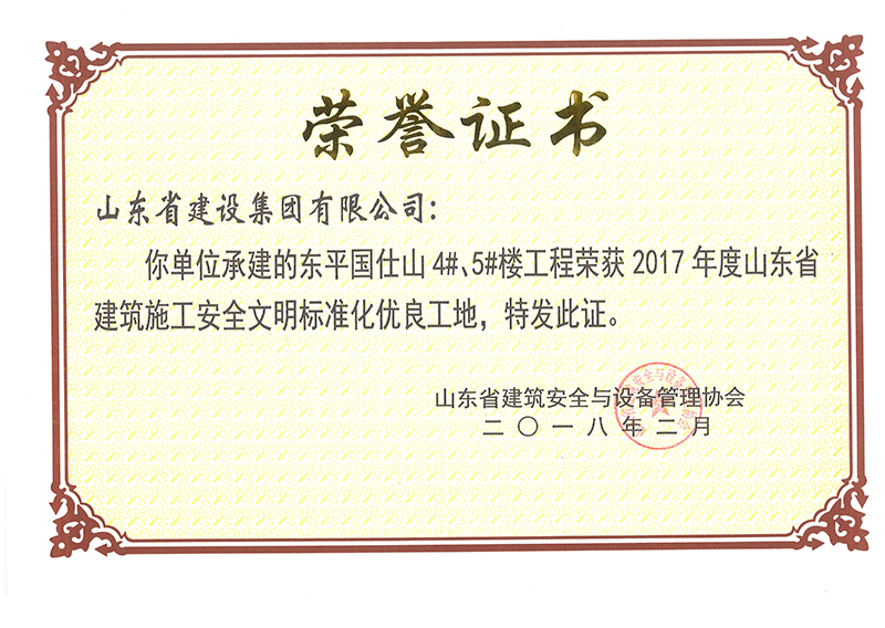 東平國仕山4#5#工程獲2017年度省安全文明標準化優良工地