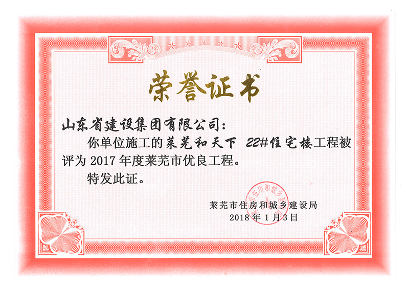 萊蕪和天下22#樓被評為2017年度萊蕪市優良工程