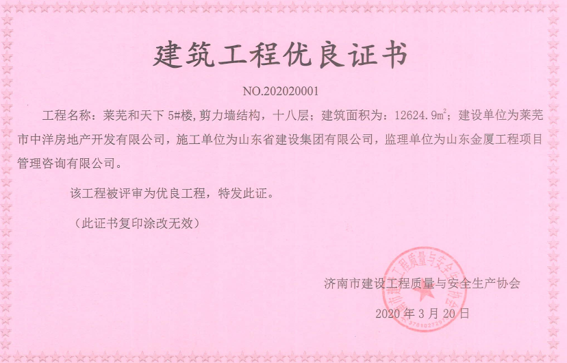 濱州雙泰·建大城10#獲2019年度濱州市建設工程優質結構工程